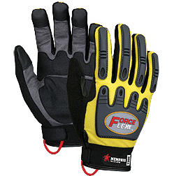 Ergonomically designed rough textured palm pad to enhance grip in dry applications and TPR padding on the back of hand and fingers for full dorsal metacarpal protection. Clarino® synthetic leather base palm with a breathable / expandable fourchettes and mesh fabric back combine for personal fit and comfort. Extra tacky fingertips enhance grip and provide longer wear. Micro terrycloth perspiration wipe on back of thumb. Adjustable wrist closure with red nylon pull tab. Machine washable, air dry.