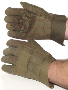 Olive drab fire retardant hot mill gloves with quilted palm, thumb and index finger (with knuckle strap) are excellent for use around hot objects and short exposures to flame. Available with either a band cuff or gauntlet cuff. Men’s sizes. Sold per dozen pair.