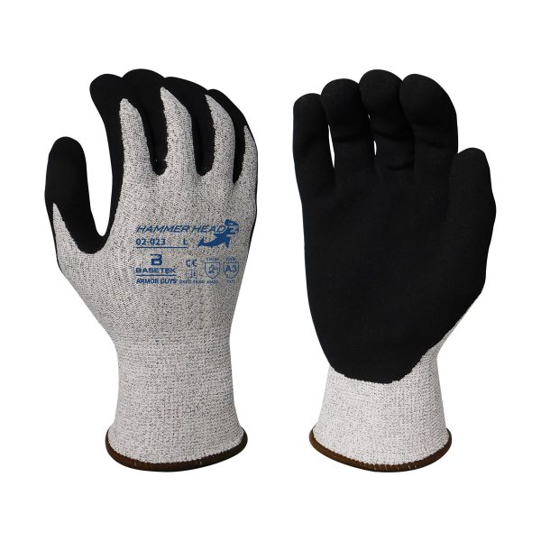 13g "Hammer Head 3" Salt & Pepper HDPE Liner Black Micro Foam Nitrile Palm Coating, ANSI A3, provides enhanced grip in oily & greasy environments. Can be used in Automotive Manufacturing, Light Manufacturing, Sheet Metal Handling, Metal Stamping, and Construction applications