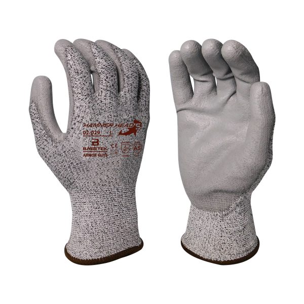13g "Hammer Head 5" Salt & Pepper HDPE Liner With Gray Polyurethane Palm Coating, ANSI A5, provised a positive grip in dry & light oil environments. Can be used in Automotive Manufacturing, Metal Stamping, Steel Handling, Construction, and Recycling