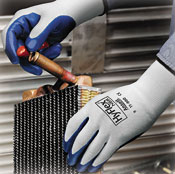 Keep oil out and safety in. Abrasion resistance and oil repellency are the key characteristics of this newest line extension. The nitrile coating prevents oil from penetrating through the glove, protecting hands from dermatitis. The glove has excellent dry grip for applications involving small-to-medium-sized parts. New "X" design formers offer ergonomical fit with additional protection for the back of the hand. Applications: Automotive assembly, Metal fabrication