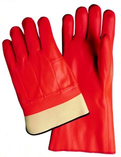 With knit wrist, safety cuff or gauntlet cuff. PVC coated gloves have three layers of insulation. Gloves resist oils, acids, salt, chemicals and caustics. PVC compound remains flexible even in sub-zero temps. Excellent for municipalities, cold storage, yard and field work, winter transportation, trash collection, construction, outdoor maintenance, fishing industry, lumber industry and working in unheated facilities. Fluorescent orange for high visibility. Men's size. Sold per dozen pair.