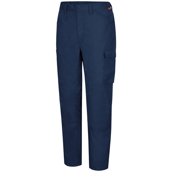 One-piece waistband with concealed button closure, Two scoop front pockets, concealed pocket on right pocket bag, Two hip patch pockets, Full crotch gusset, Utility loop extension on front belt loop, Cargo pocket with snap closures on left leg, Double utility pocket on right leg, Double articulated knees.