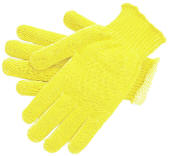 This is a 7 gauge knit Kevlar string glove on the outside and plated with cotton on the inside. The glove provides cut protection from sharp edges of metal, ceramics, glass or plastic.