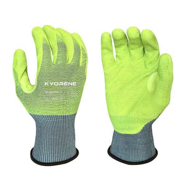 18g Hi Vis Kyorene Pro® Liner With Hi Vis HCT® Lite Nitrile Palm Coating, Thumbcrotch Reinforcement, Touchscreen compatible, ANSI A4, silicone free, no stainless steel or fiberglass, thermal regulating and odor neutralizing.Can be used in Automotive Manufacturing, Sheet Metal Handling, Metal Stamping, Steel Processing and Construction applications