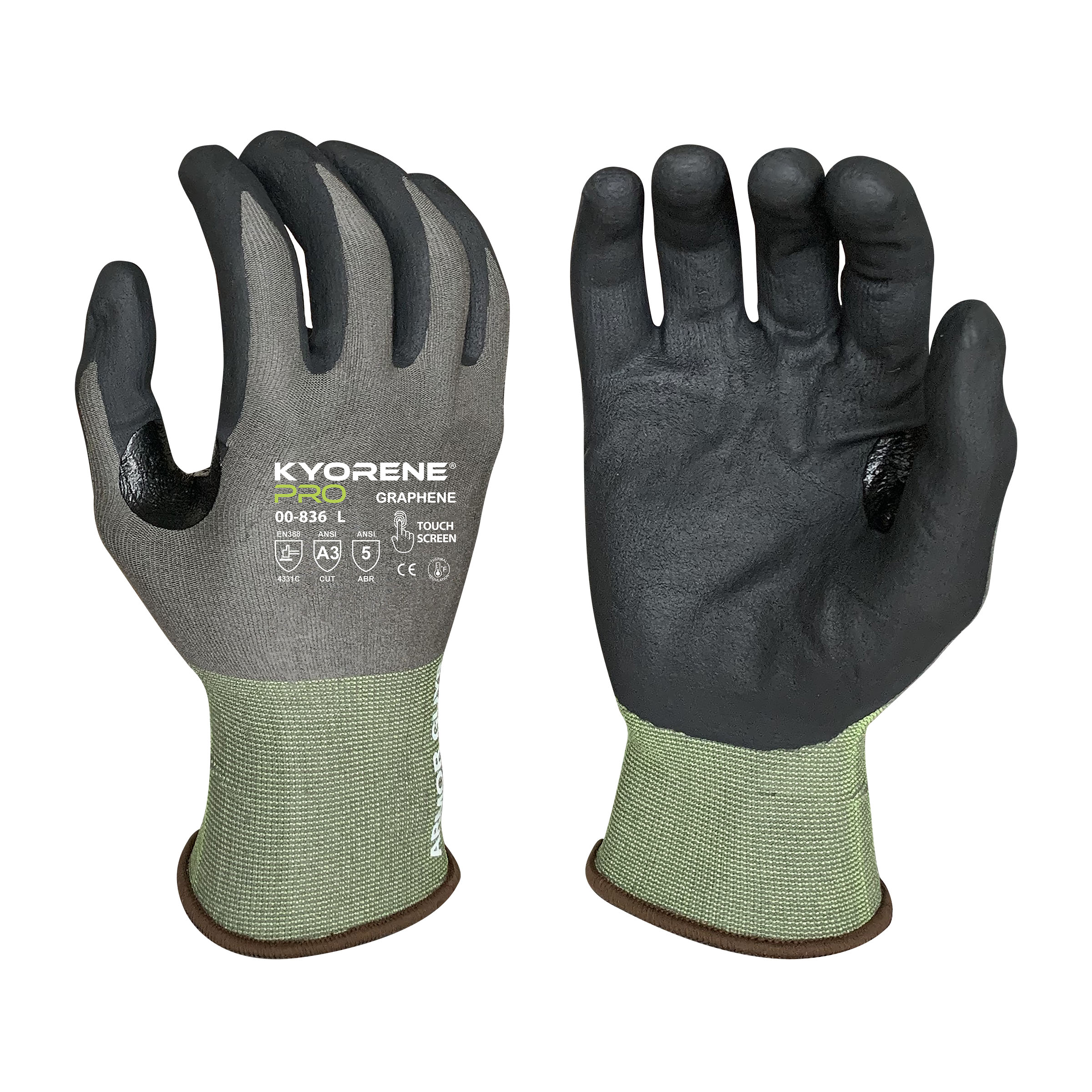 18g 100D Gray Kyorene Pro® Liner With Black HCT® Nano-Foam Nitrile Palm Coating, Touchscreen compantible, ANSI A3, silicone free, no stainless steel or fiberglass, thermal regulating and odor neutralizing. Can be used in Automotive Manufacturing, Appliance Manufacturing, Metal Stamping, Sheet Metal Handling, Handling Extruded Plastics Construction