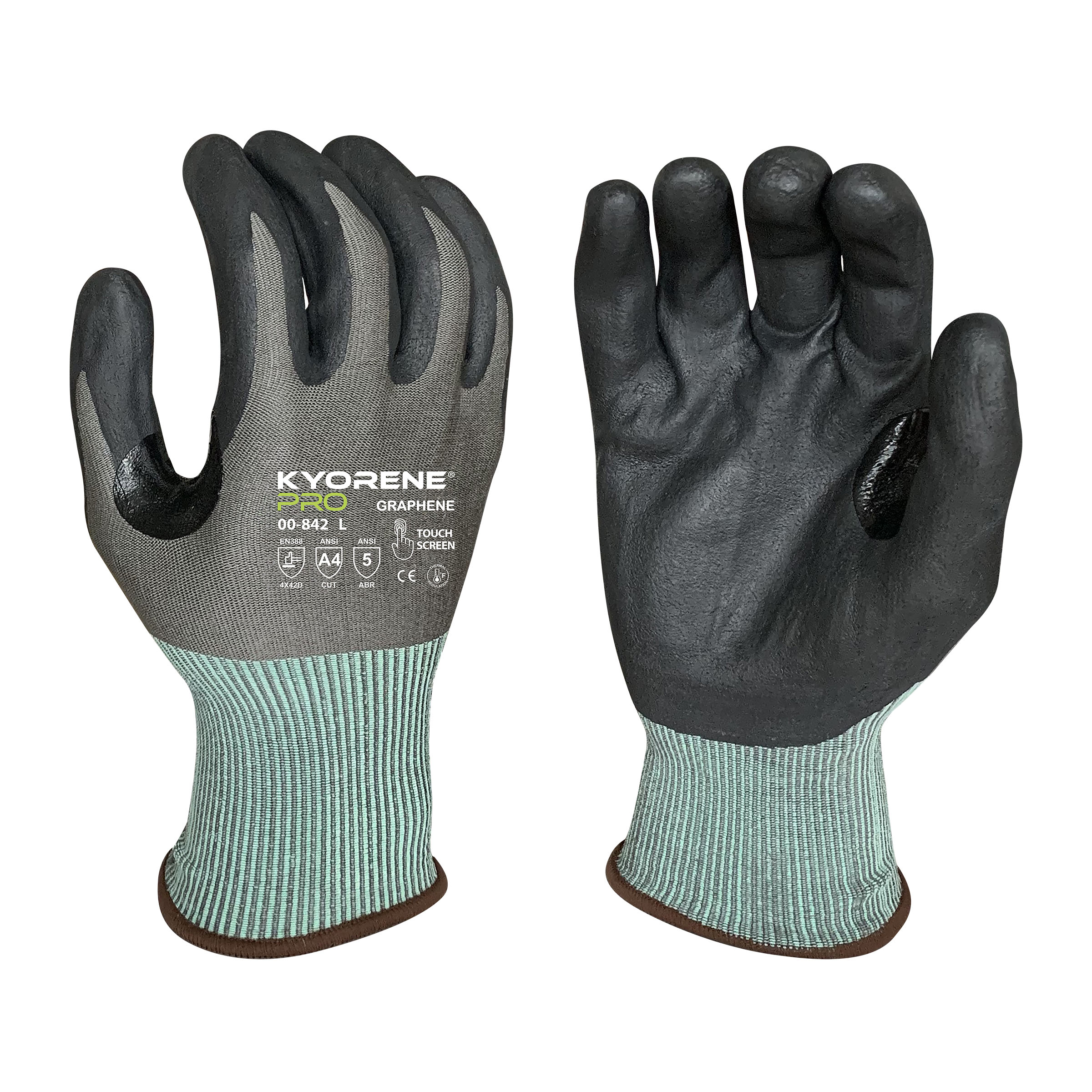 18g Gray Kyorene Pro® Liner With Black HCT® Nano-Foam Nitrile Palm Coating, Thumbcrotch Reinforcement, Touchscreen compatible, ANSI A4, silicone free, no stainless steel or fiberglass, thermal regulating and odor neutralizing.Can be used in Automotive Manufacturing, Sheet Metal Handling, Metal Stamping, Steel Processing and Construction applications