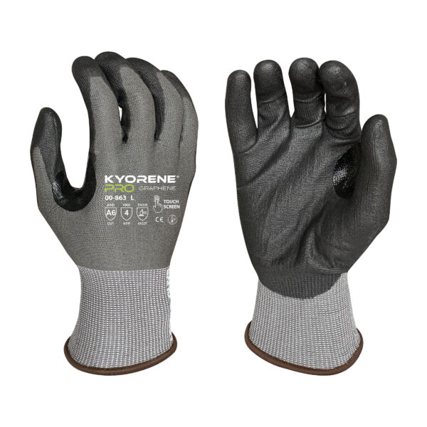 18g Gray Kyorene Pro® Liner With Black Polyurethane Palm Coating, Thumbcrotch Reinforcement, Touchscreen compatible,ANSI A6, silicone free, no stainless steel or fiberglass, thermal regulating and odor neutralizing. Can be used in Automotive Manufacturing, Metal Fabrication, Steel Processing, and Construction applications