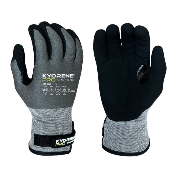 Kyorene Pro® 18g Gray Winter Liner With Black HCT® Micro Foam Nitrile Palm Coating, Poly-Acrylic Lining, Velcro Closure, Thumbcrotch Reinforcement,Touchscreen compatible, ANSI A6, silicone free, no stainless steel or fiberglass, thermal regulating and odor neutralizing. Can be used in Construction, Cold Storage, Outdoor Winter Work, and Landscaping applications
