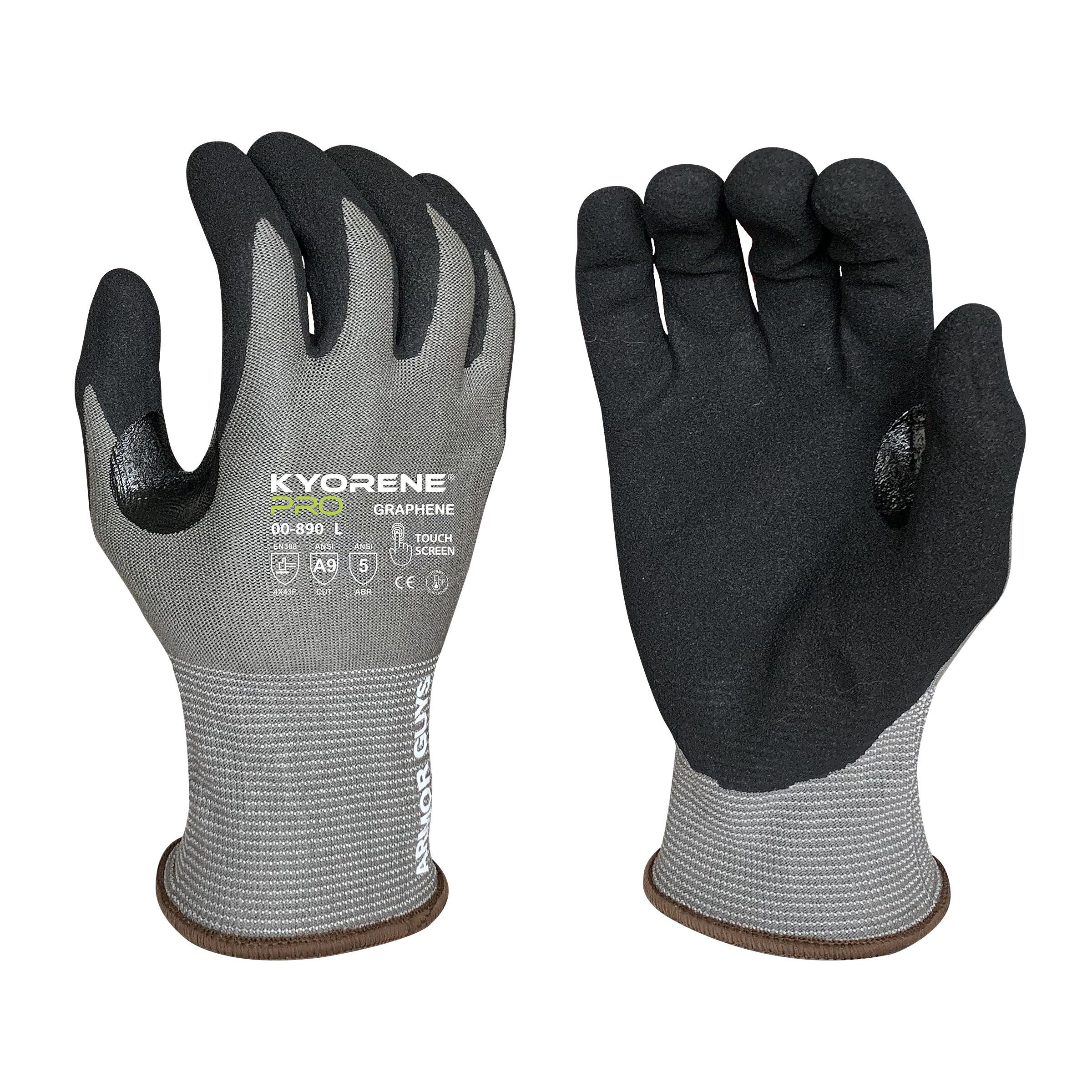 Kyorene Pro® 18g Gray Liner With Black HCT® Micro Foam Nitrile Palm Coating, ANSI A9, Touchscreen compatible, silicone free, no stainless steel or fiberglass, thermal regulating and odor neutralizing. Can be used in Automotive Manufacturing, Sheet Metal Handling, Metal Stamping, and Plastics applications