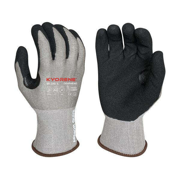 15g Gray Kyorene® Liner With Black HCT® Micro Foam Nitrile Palm Coating And Reinforced Thumb Crotch, ANSI A2, Touchscreen compatible, thermal regulating, odor neutralizing. Can be used in Automotive Manufacturing, Appliance Manufacturing, Sheet Metal Handling, and Construction applications