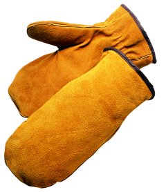 Thick pile lined bourbon brown split cowhide mitten, shirred elastic front, wing thumb. Good for working in freezers and other cold temperature industry. Available in sizes small through XL. Sold per dozen pair.