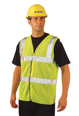 3M Scotchlite #8910 reflective tape is compliant with Class 2 configuration . Two 360º horizontal reflective stripes and two vertical shoulder stripes. Machine washable. Other sizes available