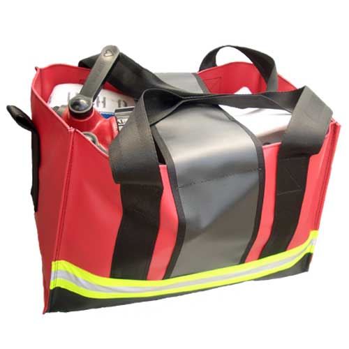 Constructed with firefighters in mind, this bag can hold 75 ft of 1 1/2" or 1 3/4" hose and accessories making it ideal for standpipe connections, high rise operations, hose operations and as a tool bag. Made of durable 22 oz. reinforced vinyl. Double thickness in side, bottom and ends. Easily carried by a 2" nylon webbing handle. For on scene visibility there is 2" reflective side trim.