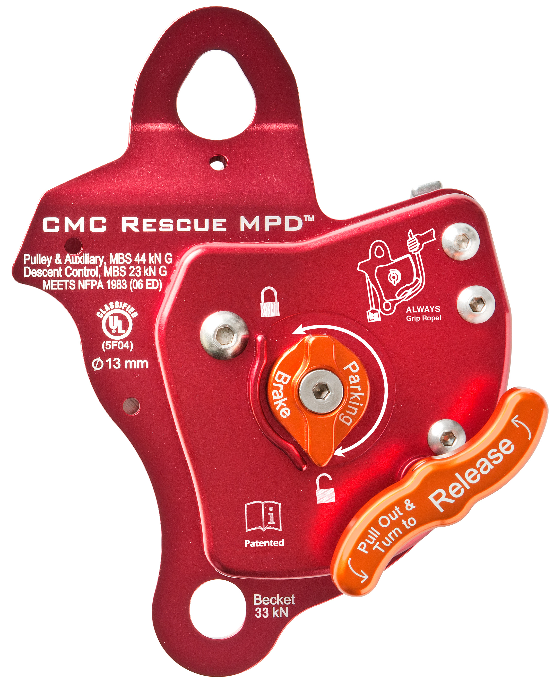 An innovation in rope rescue! The MPD allows you to go from lowering to raising without changing hardware. More than nine years of research and development went into the patented Multi-Purpose Device (MPD), which features major innovations in advanced technical hardware for rope rescue professionals. The MPD’s high-efficiency pulley, with an integral rope-grab mechanism, allows it to be used as a lowering device on the main line and belay line systems and be quickly changed over to a raising system without switching out or replacing hardware. The combination of essential features into a single device simplifies on-scene rigging, expediting the rescue. The revolutionary MPD increases user safety with: Reduced Weight, Fewer Components, Faster Rigging, Quick Changeovers, Simplified, Training, and Lower Risk. The MPD is UL Classified as a pulley, descent control device and belay device.