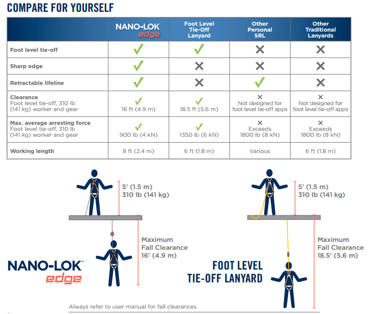 Live on the edge with confidence with the Nano-Lok Edge. Foot level tie-off… no problem! In your line of work, anchoring at your feet may be the only option. Traditional Equipment is not designed for this application. In fact, using a traditional product anchored at your feet may increase the risk of injury and create a false sense of security. The Nano-Lok edge is speciically designed for foot level tie-off, virutally eliminating these hazards. Sharp Edges...no problem! Nano-Lok edge takes the guesswork out of your work. Adhering to the most stringent standards, Nano-Lok edge is engineered to perform in the toughest sharp edge conditions. Why? because on your job site, sharp edges are a reality, and you never know how sharp they are. Now you don't have to. Features: Foot Level Tie-Off for Sharp Edges! Designed for 8ft.(2.4m) working length. Ergonomically designed for comfort. Single and 100% tie-off units available. Meets the most stringent safety standards. Wow! It’s orange. Designed to let you know your worker has the right gear for the job. Nano-Lok Edge is your answer! INTEGRATED, BACKPACK-STYLE ENERGY ABSORBER: The energy absorber and connector work together to limit forces to defeat sharp edges. Backpack design that stays tight to the harness and evenly disperses the unit’s weight. PATENTED CONNECTOR: Providing 360 degree rotation, the direct-to-harness connection provides seamless integration of the energy absorber and leaves the D-ring open for rescue or other equipment. GLOBAL SHARP EDGE ICON: Sharp Edge Pictogram. DBI-SALA universal icon to quickly and easily identify sharp edge product.TOUGH AND FLEXIBLE GALVANIZED CABLE LIFELINE: The 8?(2.4m) of 3/16?(5mm) cable provides maximum range of motion, durability, and cut resistance. IMPACT-RESISTANT HOUSING: Lightweight thermoplastic housing provides maximum durability. HOOK OPTIONS: Designed to meet your unique needs,the Nano-Lok™ edge comes in many configurations. More info on Capital Safety's website www.capitalsafety.com