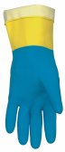 This flock-lined neoprene on latex glove has a 28 mil thickness on the blue area and a diamond embossed grip on palm and fingers. The component materials comply with FDA regulations for food contact. Applications include- aircraft assembly, automotive, battery manufacturing and the printing industry. Sold per dozen pair.