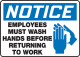 NOTICE EMPLOYEES MUST WASH HANDS BEFORE RETURNING TO WORK (GRAPHIC) - Enforce employee hygiene by placing a reminder to wash their hands. Avoid unwanted bacteria incidents and contaimination issues. Grab workers' attention using this bold handwashing graphic sign. Traditional OSHA-style signs, tags and labels are the most widely recognized design format in the industry. Notice header indicates information considered to be important but not hazard-related.