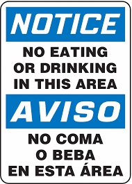 NOTICE NO EATING OR DRINKING IN THIS AREA, (ENGLISH, SPANISH) - Provide notice that food and drink are prohibited with a bilingual safety sign. Notify workers in designated area that food and drink are prohibited. Prevent messes, destruction of sensitive equipment, or food contamination. Communicate notice to English and Spanish speaking employees. Bilingual signs help protect all your workers. Traditional OSHA-style signs, tags and labels are the most widely recognized design format in the industry. Notice header indicates information considered to be important but not hazard-related.