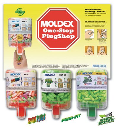 One-Stop PlugShop® Helps Employers comply with OSHA 1910.95, which required that employees be given the opportunity to select their hearing protection from a variety of suitable hearing protectors provided by the employer. You'll get increased compliance by placing the One-Stop PlugShop® and it's high visibility poster in easily accessible areas. The One-Stop Plug Shop can be customized to fit all Moldex® earplugs: foam, reusable, uncorded, high, moderate, and low NRRs-choose the Moldex® products that best fit your needs