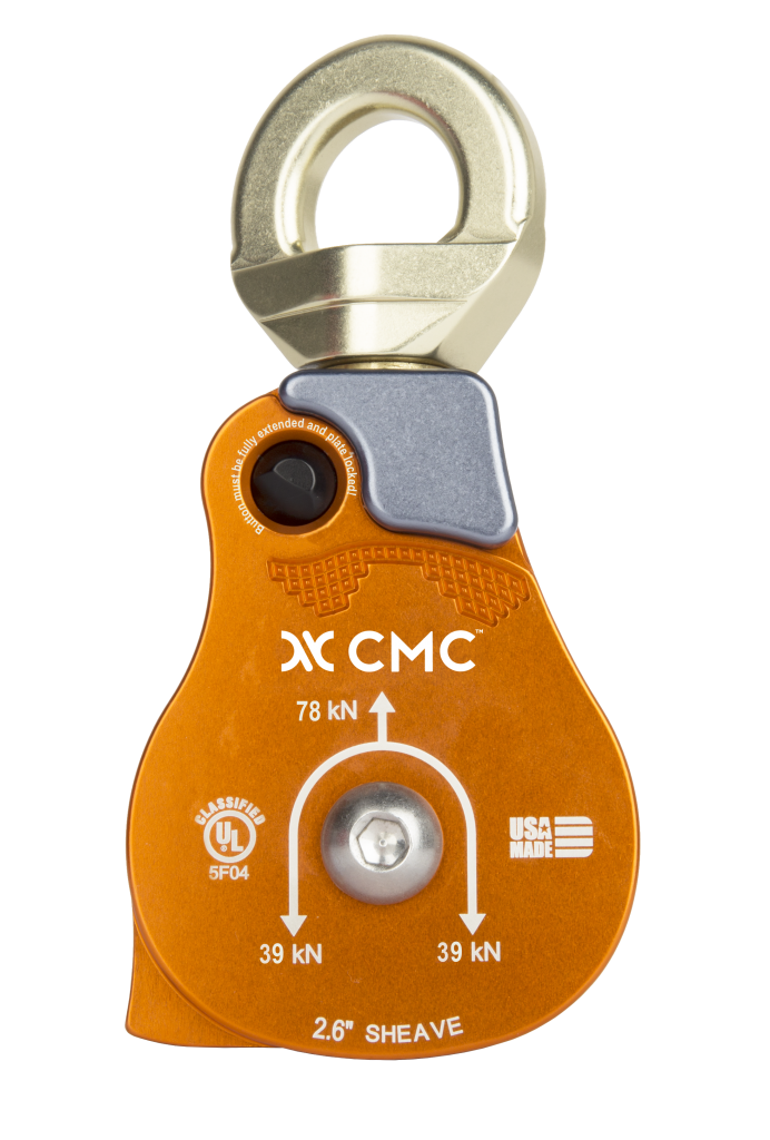 The larger sized Prusik-minding pulley (PMP) Swivel 2.6 is ideal for industrial rescue use where maximum pulley efficiency and strength is important. The rotating swivel aligns the rope with the direction of the pull. By combining the swivel with the pulley, overall system length is minimized, increasing travel. The patented pivoting side plate allows the rope to be quickly inserted. Prusik-minding side plate opens without having to disconnect the pulley from the anchor. A double-detent button prevents accidental opening of side plate. Sealed ball bearings provide maximum efficiency. Aluminum sheave. Works with rope sizes up to 13 mm. UL Classified to NFPA 1983 – General Use. 3 Sigma MBS 78 kN (17,534 lbf).