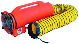 Air systems manufactures a combination ventilation fan and duct storage unit to meet the most demanding customer needs. The rugged polyethylene duct cannister is securely attached to one of our rugged lightweight fans to make an ideal ventilator for the customer who wants a one piece ventilation system. The AC version, SVF-8AC, has a 1/3 HP -115 VAC, an 8” diameter outlet and 1395 cfm free air.