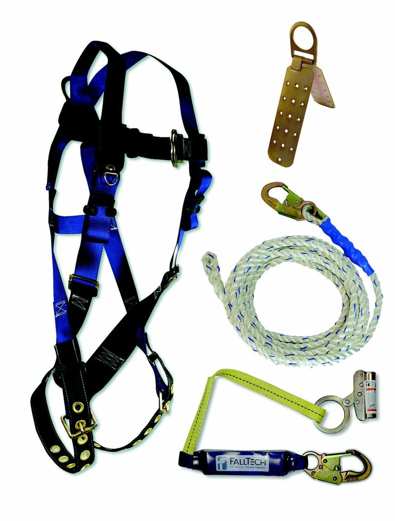7016 Harness; 8150 Vertical Lifeline, 8368 Shock Absorbing Lanyard with Trailing Grab; 7410 Roof Anchor.