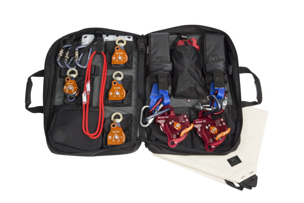 When setting up systems, this well-organized kit provides efficient access to all the rigging hardware needed to set up a main line and belay. The case can be laid on the ground or suspended from the side of a vehicle with integrated gutter hooks, yet when closed, fits easily into a vehicle cabinet or behind the seat.