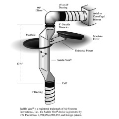 The Saddle Vent® Tank and Manhole Ventilation provides continuous access and sunlight to manholes during ventilation. Unobtrusive vents take up only 3" of space allowing for easy entrance and exit. Manhole Saddle Vent® is 43 ½"L x 14"W x 8" outside diameter. Tank vents measure 27 ¾"L x 13 ¾" W x 8" outside diameter. Universal mount uses the weight of the manhole cover to hold saddle vent in place. 90 degree elbow maintains unrestricted air flow between vent and ducting. Duct-to-duct connector easily couples ducting together for extended length.