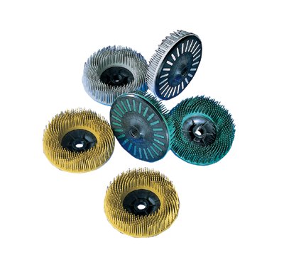 Brush-like bristle disc removes coarse coatings from the large open areas of a work-piece. Works on right angle tools quickly and easily with little or no pressure