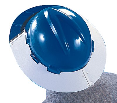 Front portion is Lexan tinted. Protects wearer's ears and neck from suns rays. Extends brim all the way around