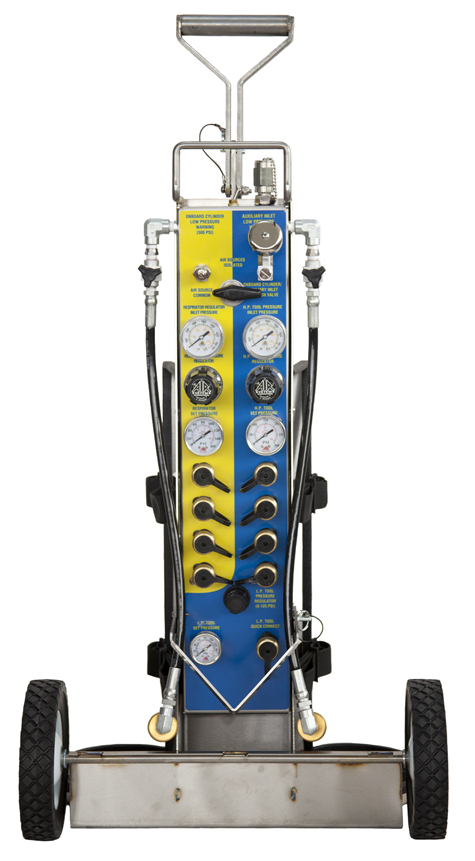 Air Systems has designed a unique stainless steel cart with a color designated control panel to allow one side of the panel to be used for primair respirator breathing air and one side for tools / secondary air requirements.