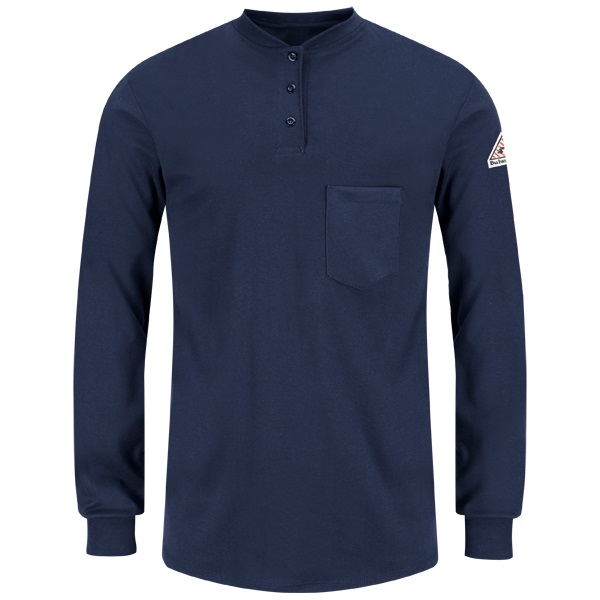 Fabric Excel FR® Flame-resistant, 7.25 oz. (245 g/m²) Interlock FR 100% Cotton-Sizes S-XL. Three button placket, Knit henley collar, Rib-knit cuff, Single spade chest pocket. Care Home Wash